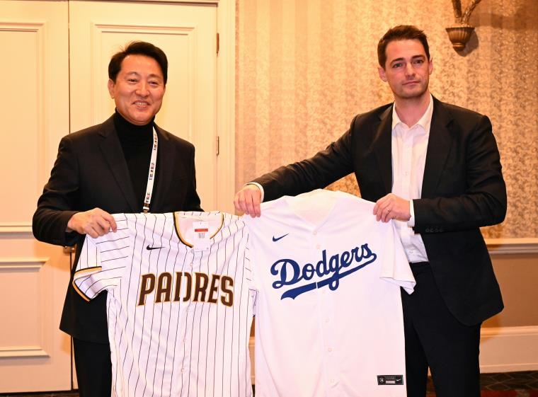 | ▲ 찰리 힐 MLB 부사장 만난 오세훈 서울시장 (라스베이거스=연합뉴스) 미국을 방문 중인 오세훈 서울시장이 9일 오후 4시(현지시간) 미국 라스베이거스 시저스 팰리스 호텔 미팅룸에서 찰리 힐 MLB 국제사업총괄 부사장(오른쪽)과 면담을 하고, 샌디에이고 파드리스와 LA 다저스 유니폼을 함께 들며 기념촬영하고 있다. 2024.1.10 [서울시 제공. 재판매 및 DB 금지] |