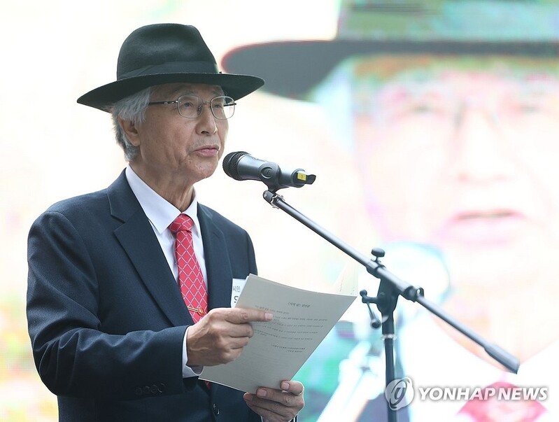 | ▲ 기념사하는 유자효 시인협회장 (서울=연합뉴스) 류영석 기자 = 1일 오후 서울 광화문광장에서 열린 제37회 시의 날 기념 시 낭송회에서 유자효 한국시인협회장이 기념사를 하고 있다. 2023.11.1 ondol@yna.co.kr |