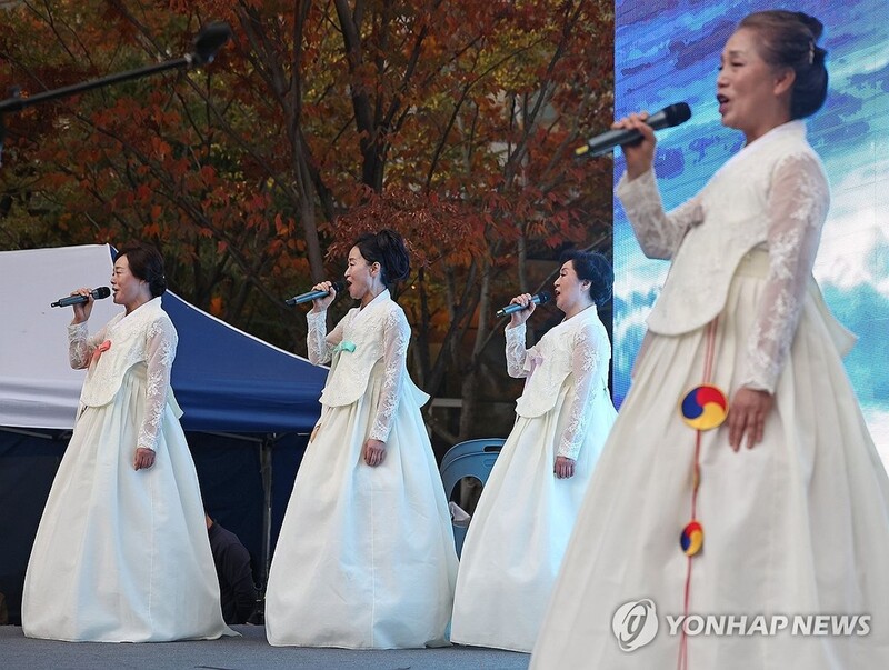 | ▲ 광화문에서 열린 시 낭송회 (서울=연합뉴스) 류영석 기자 = 1일 오후 서울 광화문광장에서 열린 제37회 시의 날 기념 시 낭송회에서 참가자들이 김용호 시인의 '남해찬가'를 낭송하고 있다. 2023.11.1 ondol@yna.co.kr |