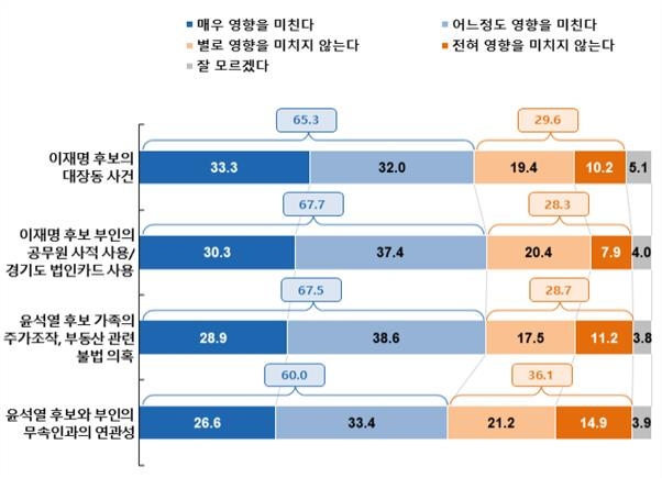 '후보 부인의 공무원 사적사용·경기도 법인카드 사용' 이슈에 영향을 받았다는 응답은 67.7%, '후보 가족의 주가조작·부동산 관련 불법 의혹'은 67.5%, '대장동 사건' 65.3%, '부인의 무속인과 연관성'은 60.0%였다.