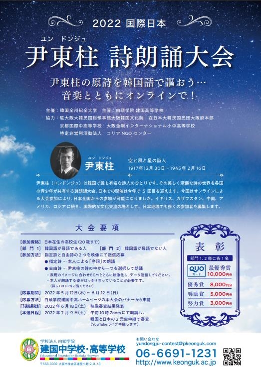 (서울=연합뉴스) 강성철 기자 = 일본 오사카 지역 재일동포 민족학교인 백두학원 건국고등학교는 '2022 국제일본 윤동주 시 낭독대회'를 개최한다고 23일 밝혔다.