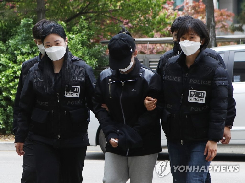 ▲ In this file photo, a 24-year-old woman (C) accused of killing her newborn son by throwing him on the ground, then neglecting him for hours, enters the district court in Incheon, just west of Seoul, to attend a court hearing to determine whether to issue an arrest warrant on April 30, 2023. (Yonhap)