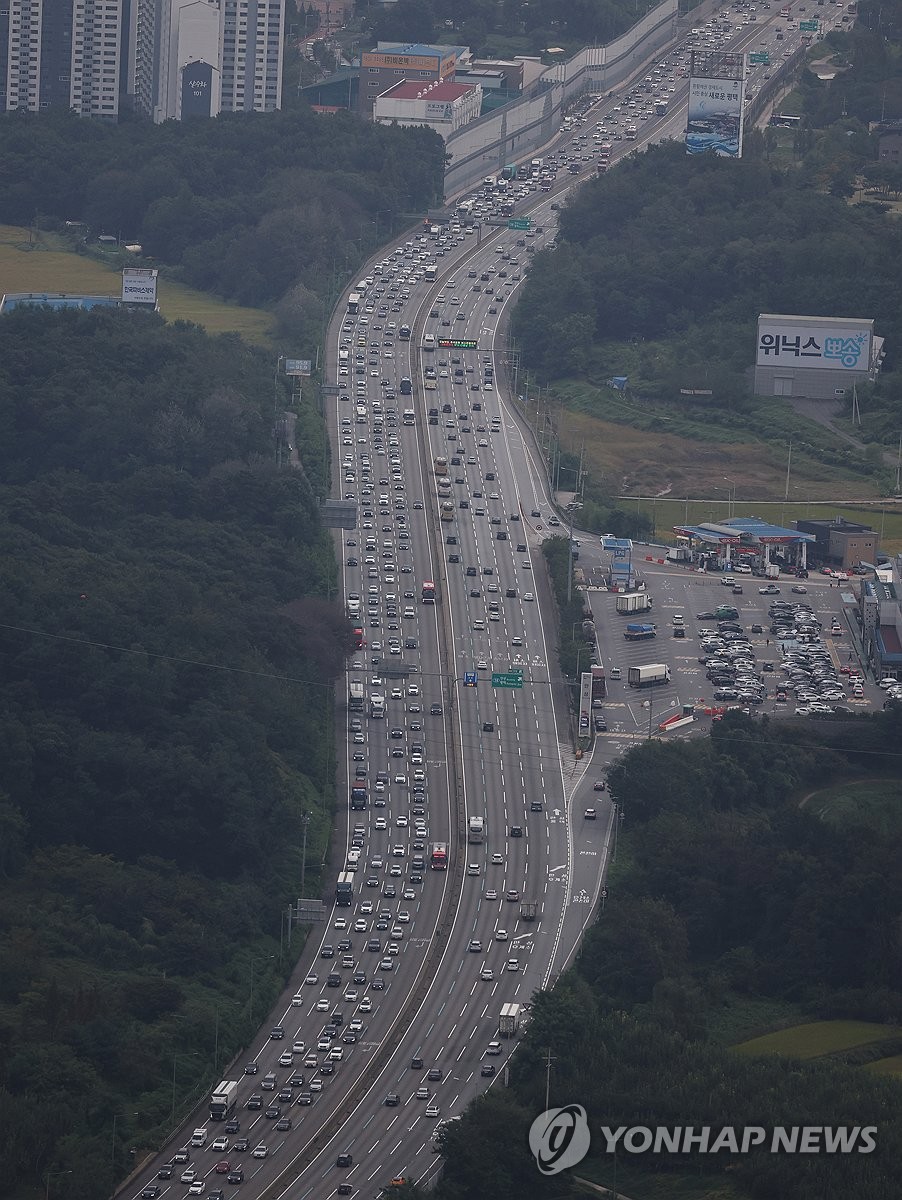 As of 5 p.m., the estimated travel time to Seoul from the southeastern port city of Busan had been 4 hours and 59 minutes, 4 hours and 39 minutes from the southeastern city of Ulsan, and 4 hours and 30 minutes from the southwestern city of Gwangju, according to Korea Expressway Corp. (KEC).
