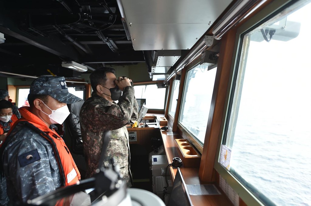 | ▲ Joint Chiefs of Staff Chairman Gen. Kim Seung-kyum visits the Sejong the Great destroyer to check troop readiness on Oct. 26, 2022, in this photo released by his office. (PHOTO NOT FOR SALE) (Yonhap) |