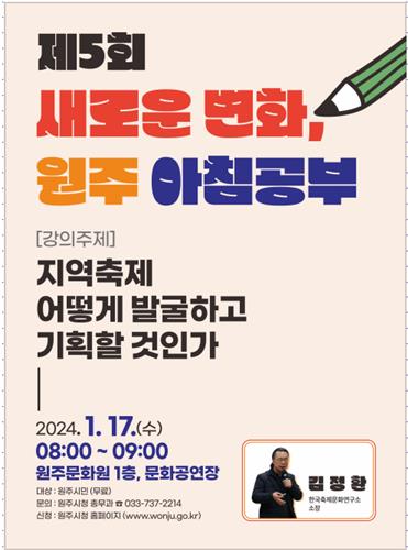 (원주=연합뉴스) 이재현 기자 = 강원 원주시는 '새로운 변화, 원주 아침 공부' 다섯번째 강의를 오는 17일 오전 8시 원주문화원 1층 문화공연장에서 개최한다고 10일 밝혔다.