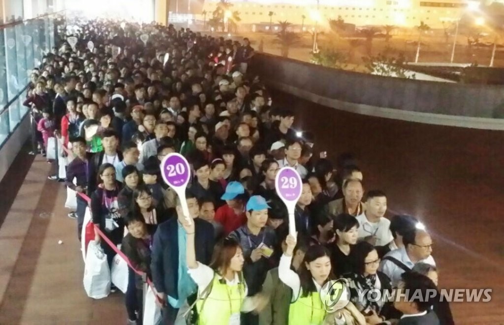 | ▲ "제주항 출국수속은 힘들어" (제주=연합뉴스) 국제 크루즈선인 코스타 세레나(11만4천500t)호를 타고 제주를 떠나려는 많은 외국인 관광객이 2015년 10월 24일 출국 수속을 받아 승선하기 위해 제주항 국제여객터미널 밖에서까지 기다리고 있다. [연합뉴스 자료사진] |