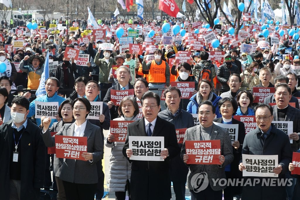 SEOUL, March 18 (Yonhap) -- Political strife escalated Saturday over the recent South Korea-Japan summit, as the liberal opposition took to the streets blasting President Yoon Suk Yeol for cozying up to Tokyo and looking past historical disputes on wartime forced labor.