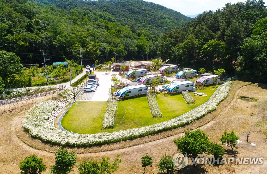 입화산 자연휴양림 별뜨락은 도심 속 산림 숙박시설로 대형 카라반 9대와 잔디마당 등을 갖추고 있다.