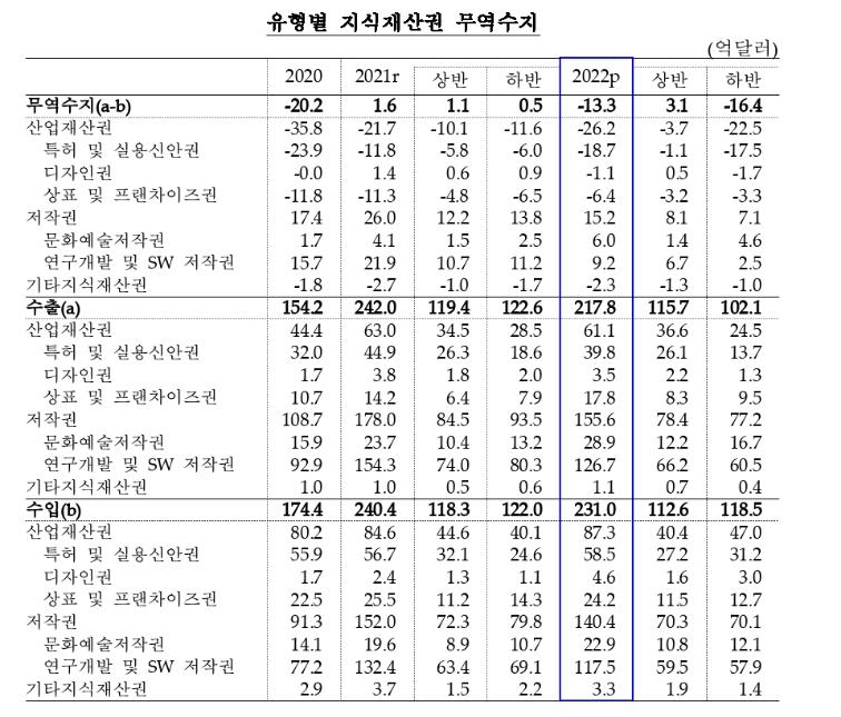 한국은행이 24일 발표한 '지적재산권 무역수지' 통계에 따르면 2022년 지식재산권 무역수지(잠정)는 13억3천만달러(약 1조7천146억원) 적자로 집계됐다.