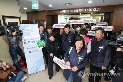 SEOUL, April 18 (Yonhap) -- The first negotiating session for next year's minimum wage fell through Tuesday, as public sector representatives stayed away from the meeting in protest of labor activists shouting slogans in the conference room.