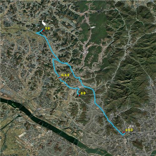 | ▲ 1777년(정조 1) 능행로(출궁) 지도화 예시 연구에서 밝혀낸 내용을 토대로 경희궁에서 나와 파주삼릉 내 영릉, 고양 서삼릉 내 희릉과 효릉, 고양 서오릉 내 홍릉으로 이동한 경로를 표시한 지도 [문화재청 제공. 재판매 및 DB 금지] |
