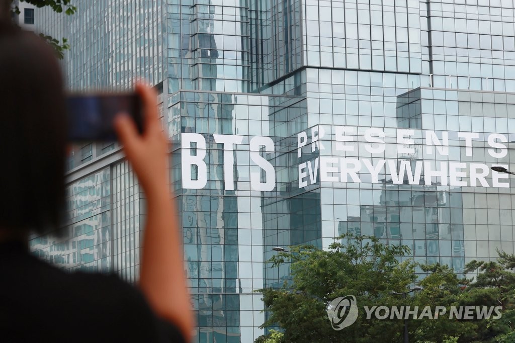 SEOUL, June 12 (Yonhap) -- Throngs of dedicated fans of K-pop giant BTS were busy taking pictures in front of the Hybe building, the entertainment company behind the band, in Seoul, on Monday morning.