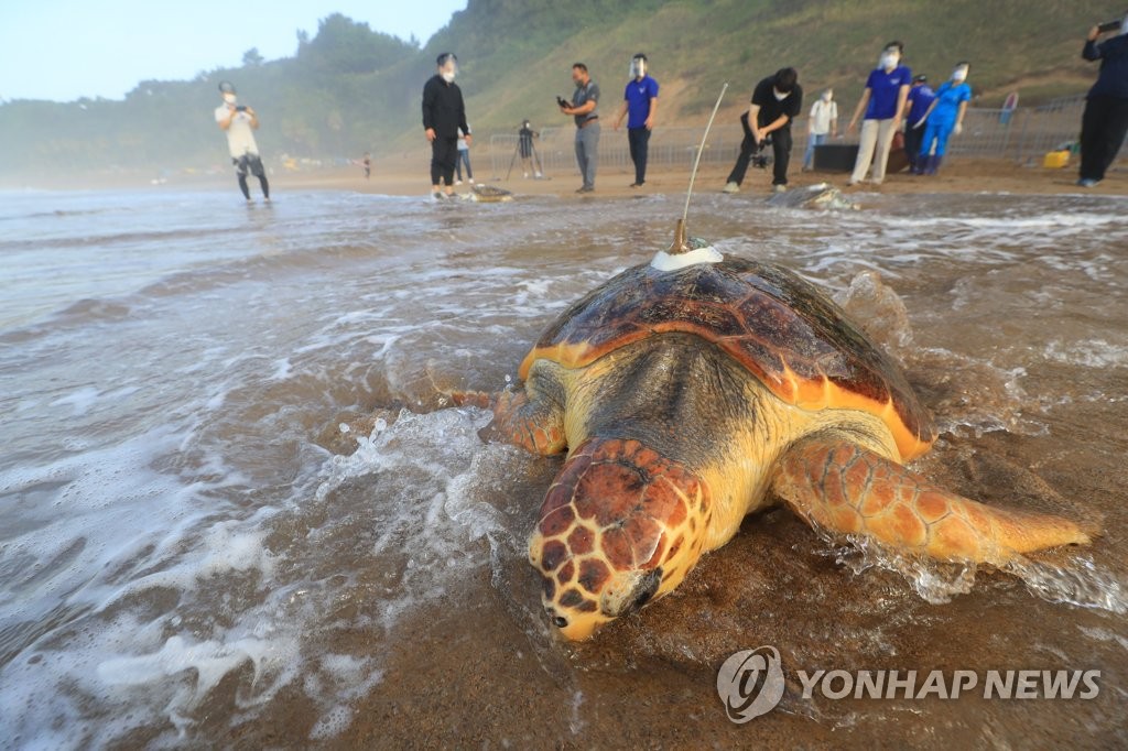 ▲ 고향 바다로 돌아가는 바다거북 (서귀포=연합뉴스) 2021년 8월 26일 오전 제주 서귀포시 중문색달해변에서 해양수산부 주최로 열린 '바다거북 방류행사'에서 한화 아쿠아플라넷 관계자들이 바다거북들을 바다로 돌려보내고 있다. [연합뉴스 자료사진]