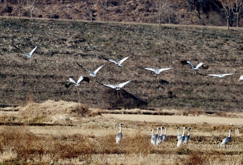 지난해에 이어 올해도 부자마을을 찾은 재두루미는 마을 일대에서 무리를 지어 이동하거나 휴식하는 모습을 보였다.