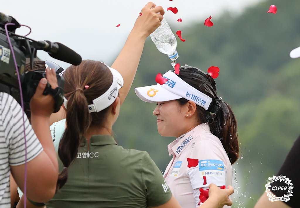 | ▲ 우승 축하 물세례 받는 박민지 (서울=연합뉴스) 박민지가 26일 경기 포천에 위치한 포천힐스CC에서 열린 'BC카드-한경 레이디스컵 2022' FR에서 우승을 차지한 뒤 축하 물세례를 받고 있다. 2022.6.26 [KLPGA 제공. 재판매 및 DB 금지] photo@yna.co.kr |