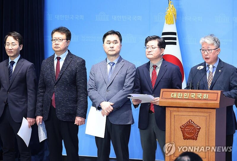 Along with the three lawmakers that left the DP, two former lawmakers, Park Won-suk and Jeong Tae-keun, were present at the conference. Park and Jeong each left their respective parties -- the minor opposition Justice Party and the ruling People Power Party -- on Thursday.