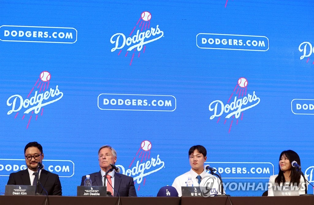 ▲ 장현석 LA 다저스 입단 기자회견 (서울=연합뉴스) 이지은 기자 = 미국프로야구 메이저리그(MLB)에 도전하는 마산 용마고의 우완 투수 장현석이 14일 오후 서울 용산구 드래곤시티호텔에서 열린 로스앤젤레스 다저스 입단 기자회견에 참석하고 있다. 왼쪽부터 딘 킴 한국 담당 국제 스카우트, 존 디블 태평양 지역 스카우팅 디렉터, 장현석, 이예랑 리코스포츠에이전시 대표. 2023.8.14 jieunlee@yna.co.kr
