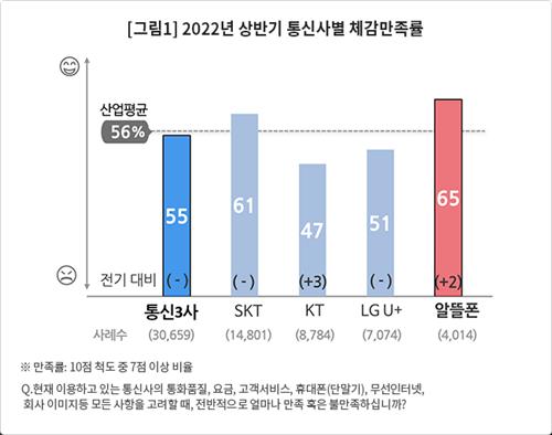 알뜰폰 사업자를 이용한 고객들의 평균 체감 만족률은 지난 조사 대비 2%P 오른 65%로 나타나, 통신3사 사용자 평균(55%)보다 10%P 높았다.