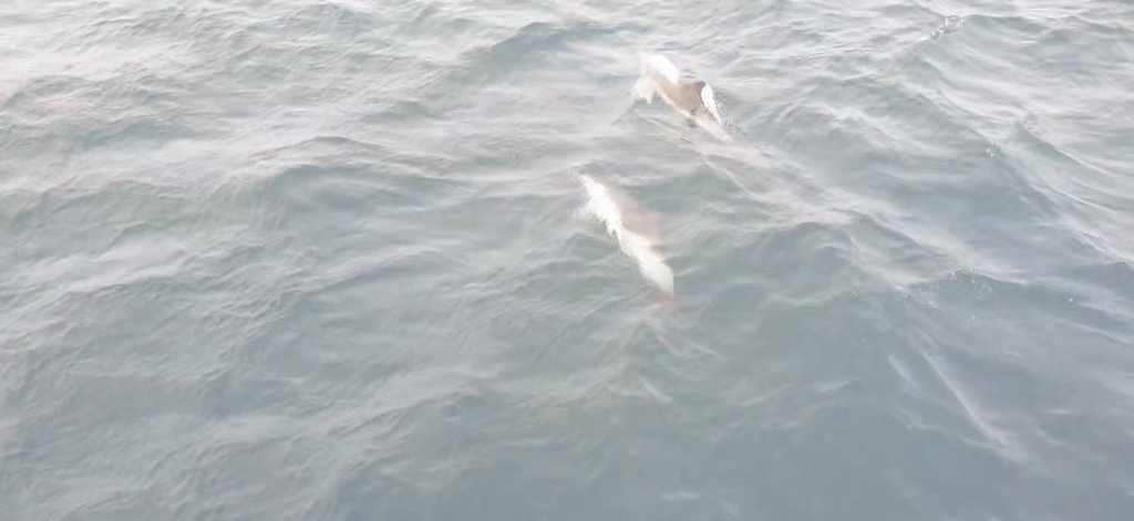 참돌고래떼는 약 15분간 모습을 드러내고 수면 위로 솟구치는 등 해상을 빠르게 유영하며 자태를 뽐냈다.