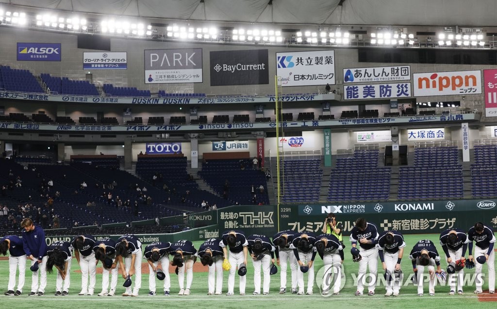 | ▲ 도쿄돔의 악몽, 여기서 끝 3월 13일 일본 도쿄돔에서 열린 2023 월드베이스볼클래식(WBC) B조 본선 1라운드 한국과 중국의 경기. 5회말 22대2 콜드게임 승리로 경기를 마친 한국 선수들이 관중석을 향해 인사하고 있다. [연합뉴스 자료사진] |