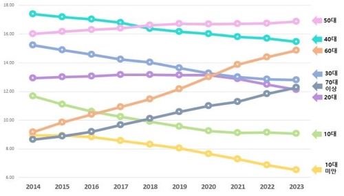 | ▲ A graph, provided by the interior ministry, of population statistics based on age groups from 2014 to 2023. (PHOTO NOT FOR SALE) (Yonhap) |