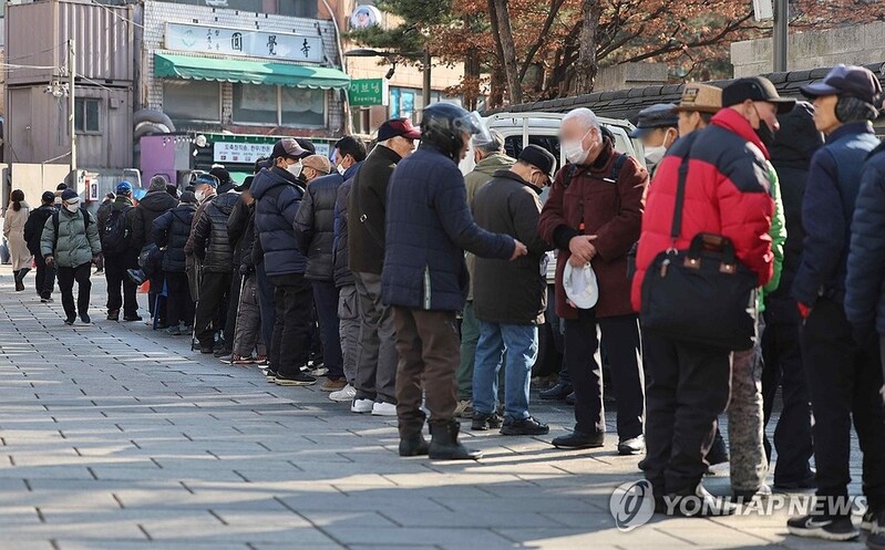 | ▲ Seniors line up to receive a free lunch in Jongno Ward in Seoul on Jan. 1, 2024. (Yonhap) |