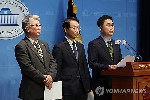 SEOUL, Jan. 10 (Yonhap) -- Three non-mainstream lawmakers from the main opposition Democratic Party (DP) announced their departure from the party Wednesday, saying the party would not be able to win in the upcoming general elections under the leadership of Lee Jae-myung.