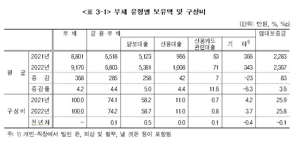 평균 부채 9천170만원, 전년 대비 4.2%↑