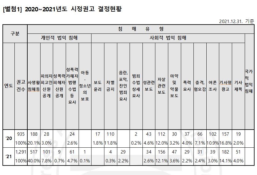 침해 유형별로 보면 사생활 관련 심의기준 위반이 40%(517건)로 가장 많았고 기사형 광고 14.1%(182건), 자살보도 12.1%(156건), 피의자·피고인 신원공개 7.8%(101건) 순이었다.