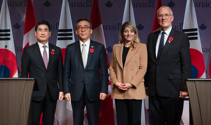 (From L to R) South Korean Defense Minister Kim Yong-hyun, Foreign Minister Cho Tae-yul, Canadian Foreign Minister Melanie Joly and Defense Minister Bill Blair pose for a photo at their inaugural "two plus two" talks among the top foreign and defense officials in Ottawa on Nov. 2, 2024, in this photo provided by Seoul's defense ministry. (PHOTO NOT FOR SALE) (Yonhap)
