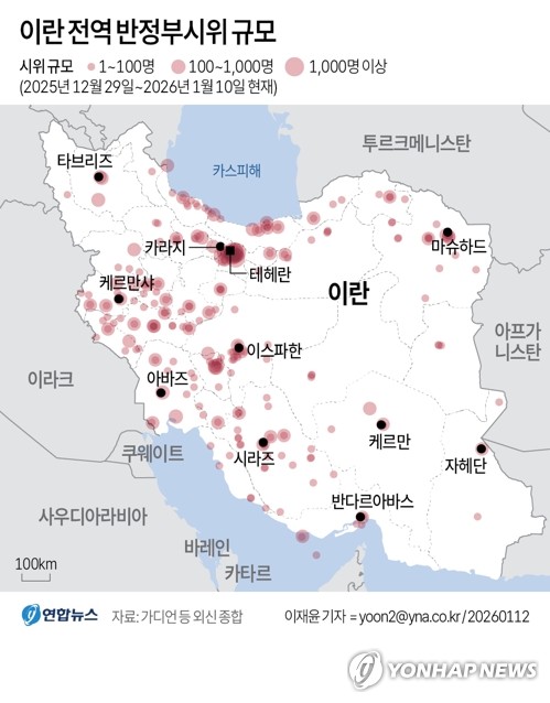 | ▲ This map shows the locations where anti-government protests have occurred in Iran. (Yonhap) |
