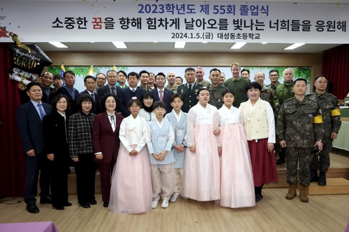 | ▲ Five students of Daeseongdong Elementary School, the only school inside of the Demilitarized Zone separating the two Koreas, and military officials of South Korea and the United Nations Command attend a graduation ceremony on Jan. 5, 2024, in this photo provided by the Korean National Defense Daily Newspaper. (PHOTO NOT FOR SALE) (Yonhap) |