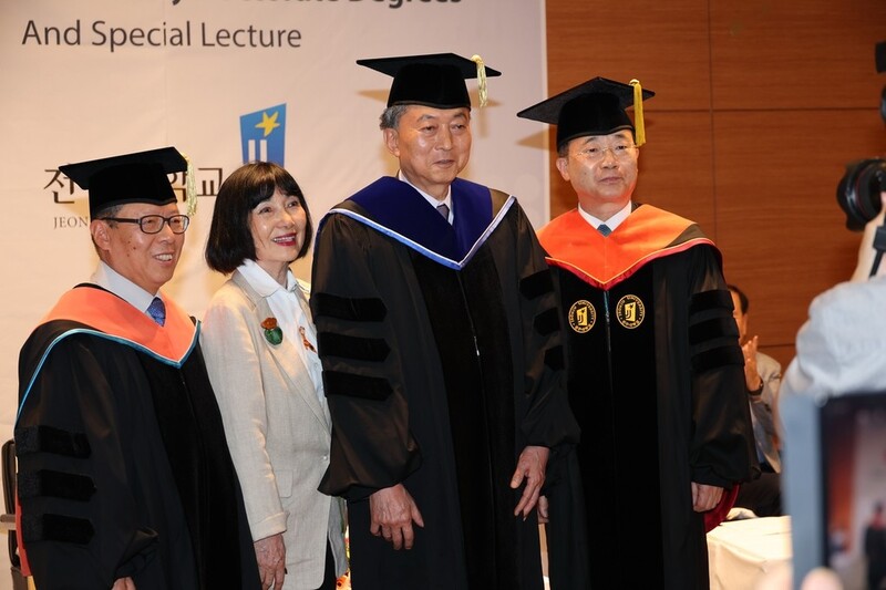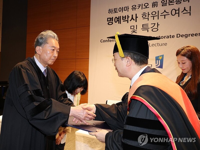 전주대학교는 이날 한일 양국의 관계 회복과 동아시아 평화 구축을 위해 노력한 하토야마 전 총리에게 명예 행정학 박사 학위를 수여했다.