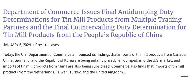 | ▲ This image, captured from the website of the Commerce Department, shows a press release on its final antidumpting duty determinations related to tin mill imports. (PHOTO NOT FOR SALE) (Yonhap) |