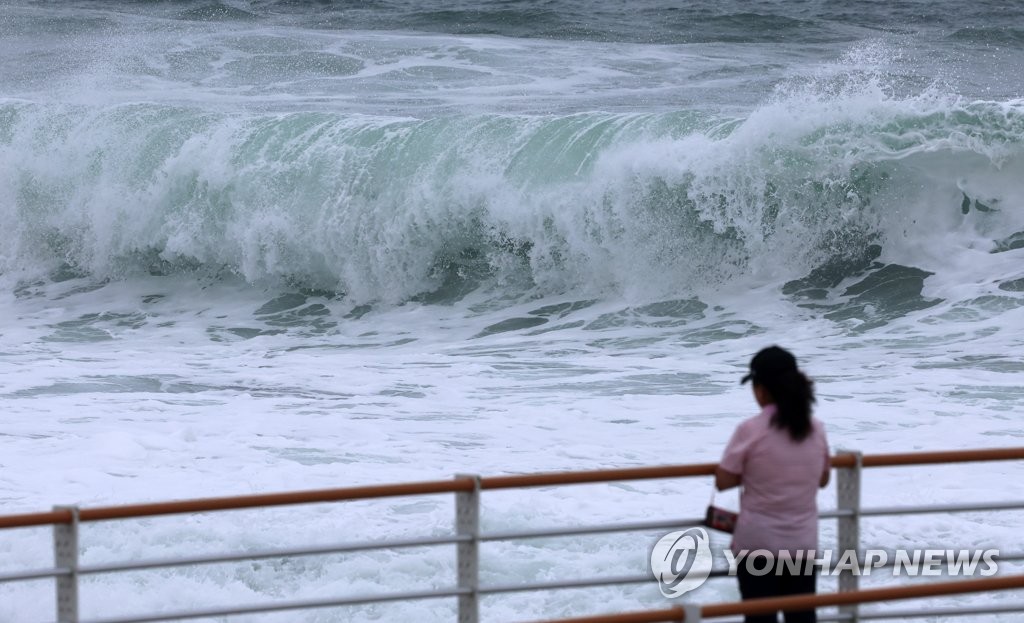 ▲ A woman looks at high waves at a beach in Gangneung, 163 kilometers east of Seoul, on Aug. 8, 2023, as Typhoon Khanun is forecast to hit the country's southeastern region two days later. (Yonhap)