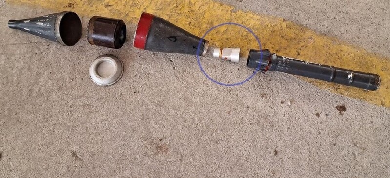 | ▲ This photo, provided by the National Intelligence Service, South Korea's spy agency, on Jan. 8, 2024, shows an F-7 rocket-propelled grenade launcher manufactured in North Korea suspected to have been used by the Hamas militant group. Korean characters are engraved inside of the fuse (in blue circle) of the grenade launcher. (PHOTO NOT FOR SALE) (Yonhap) |