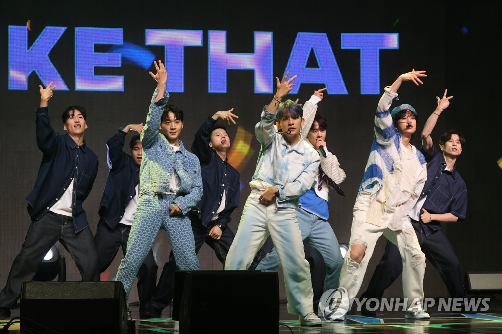 | ▲ 틴탑 새 앨범 '포슈어'로 컴백 (서울=연합뉴스) 류효림 기자 = 그룹 틴탑이 4일 오후 서울 광진구 예스24라이브홀에서 열린 새 앨범 '포슈어'(4SHO) 발매 기념 쇼케이스에서 타이틀곡 '휙' 무대를 선보이고 있다. 2023.7.4 ryousanta@yna.co.kr |