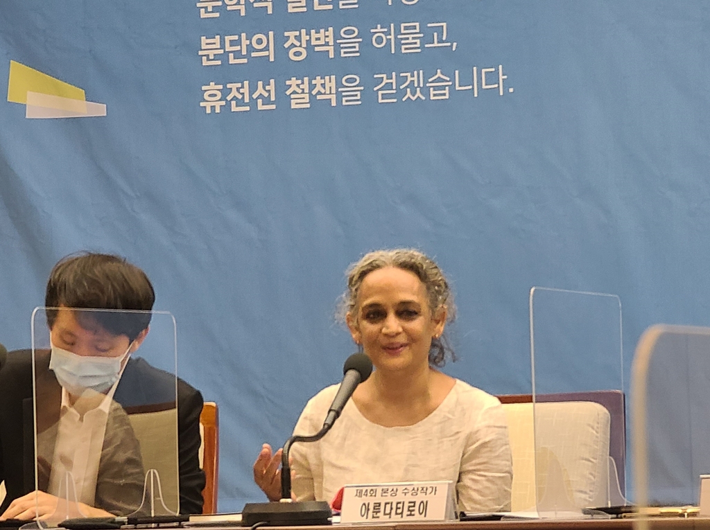 이날 회견에는 2020년 제4회 이호철문학상을 받은 인도 대표 소설가이자 사회운동가인 아룬다티 로이(60)도 함께 했다.