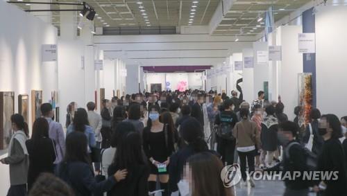 | ▲ (서울=연합뉴스) 류효림 기자 = 15일 오후 서울 강남구 삼성동 코엑스에서 열린 '한국국제아트페어'(키아프)에서 관람객들이 전시를 둘러보고 있다. 2021.10.15 |