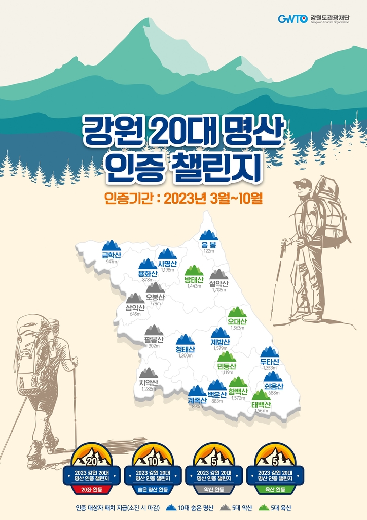 이태우 강원도관광재단 관광콘텐츠팀 팀장은 "강원 20대 명산 인증 챌린지를 통해 코로나 엔데믹 이후에도 지속해서 증가하고 있는 산악 관광객들을 강원도로 유입하기 위해 총력을 기울이겠다"고 말했다.