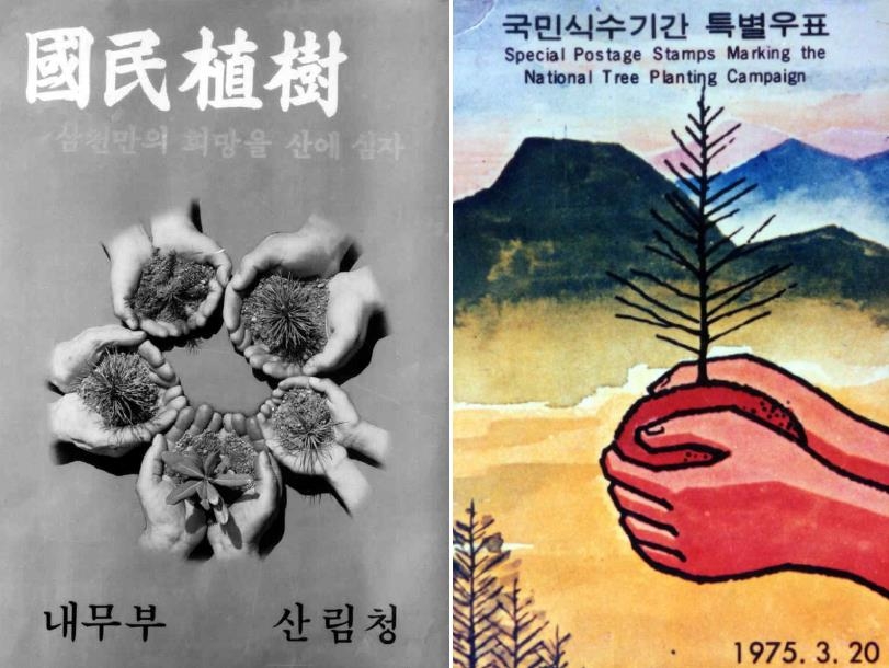 | ▲ '산림 녹화 기록물' 자료 왼쪽부터 1970년대 홍보물, 1975년 국민식수기간 특별 우표 [문화재청 제공. 재판매 및 DB 금지] |