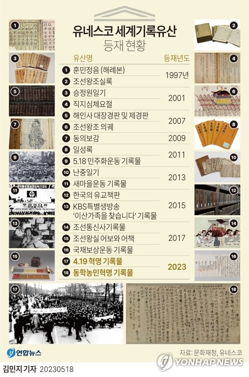 | ▲ [그래픽] 유네스코 세계기록유산 등재 현황 (서울=연합뉴스) 김민지 기자 = 유네스코(UNESCO)는 18일(현지시간) 프랑스 파리에서 열린 집행이사회에서 한국 근현대사 주요 기록물인 '4·19혁명 기록물', '동학농민혁명 기록물' 등 2건의 세계기록유산(Memory of the World) 등재를 최종 승인했다. minfo@yna.co.kr 트위터 @yonhap_graphics 페이스북 tuney.kr/LeYN1 |