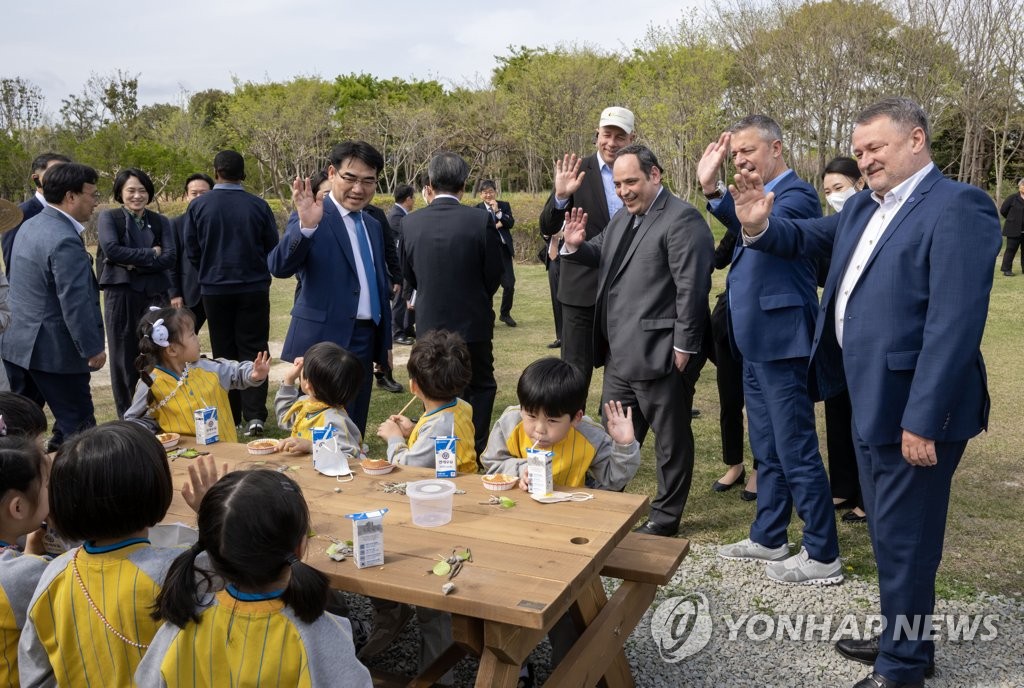 생태 체험에 나온 40여명의 어린이집 아이가 야외에 설치된 테이블에 앉아 간식을 먹고 있는 모습을 보고 실사단들이 먼저 다가가 아이들과 하이 파이브를 하는 등 친근함을 표시했다.