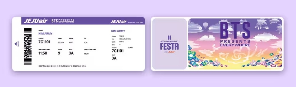 원래 주황색인 탑승권도 BTS와 팬덤 '아미'를 상징하는 보라색으로 바꾼다. 오는 12일부터 다음 달 12일까지 한 달간 국제선을 운항하는 국내외 모든 지점 체크인카운터에서 수속 시 보라색 탑승권을 받을 수 있다. 키오스크·모바일 탑승권에는 적용되지 않는다.