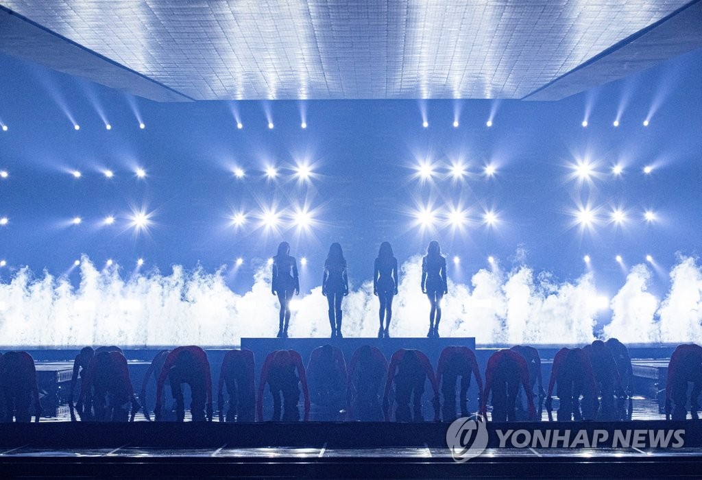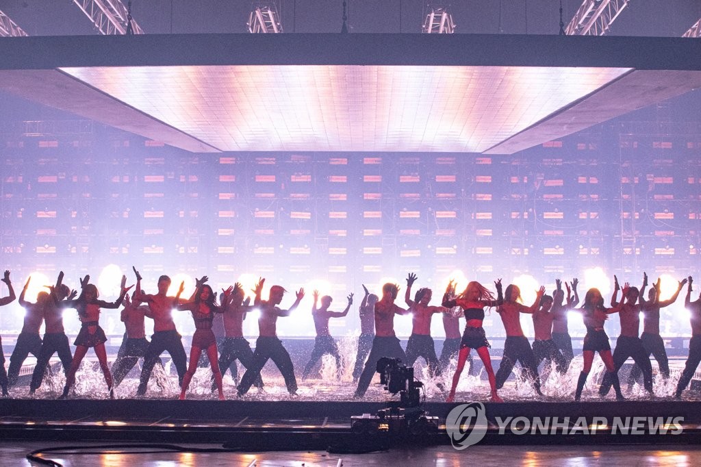 (서울=연합뉴스) 김효정 기자 = 타오르는 불꽃을 뒤로 하고 블랙핑크 네 멤버가 물로 채운 무대 위로 걸어 나왔다. 히트곡 '뚜두뚜두'에 맞춰 댄서들과 함께 군무를 펼치자 무대 가득 물보라가 일어 물과 불의 향연을 방불케 했다.