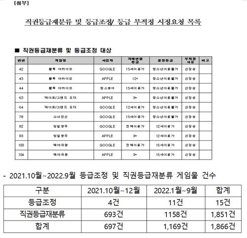 국회 문화체육관광위원회 소속 더불어민주당 이상헌 의원이 13일 게임위로부터 제출받은 자료에 따르면 게임위는 지난해 10월부터 지난달까지 게임물 총 1천851건에 대해 '직권 등급 재분류' 조처를 내렸다.