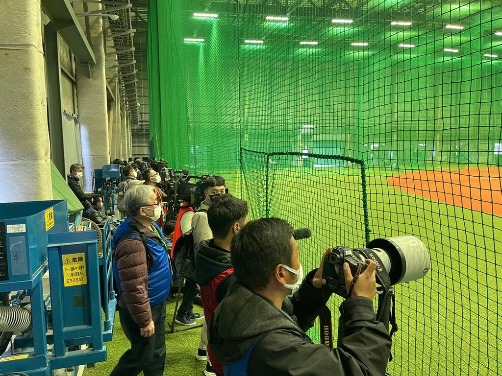 오타니의 훈련 장면을 담기 위해 수십 대의 방송 카메라가 훈련장 그물 뒤에 배치됐고, 사진기 셔터음도 끊이지 않았다.