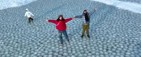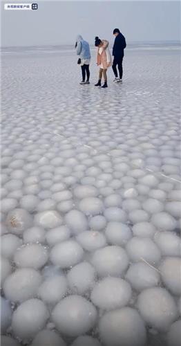 15일 왕이(網易)에 따르면 최근 중국 지린(吉林)성 타오난(조<삼수변 兆>南)의 쓰하이(四海)호수(1천600만㎡)가 얼면서 빙판 아래에 새알심같이 둥근 얼음덩어리 수만 개가 형성됐다.