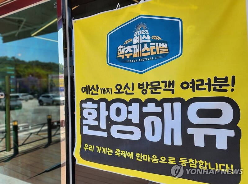 | ▲ "환영해유" (예산=연합뉴스) 김소연 기자 = '2023 예산 맥주페스티벌'이 개막한 1일 예산시장 인근 한 카페에 '환영해유'라는 현수막이 붙어있다. 예산시장 인근 업체 18곳은 바가지요금을 잡는다는 취지로 축제 기간 음식 가격을 일부 인하한다. 2023.9.1 soyun@yna.co.kr |