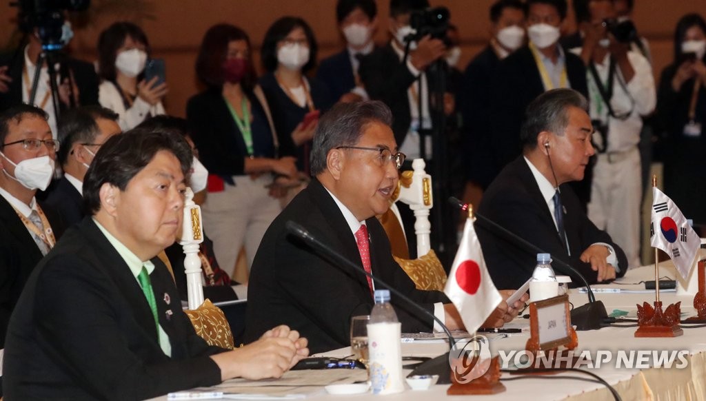 | ▲ South Korean Foreign Minister Park Jin (C) speaks during the ASEAN Plus Three Meeting, with his Chinese and Japanese counterparts - Wang Yi (R) and Hayashi Yoshimasa - seated next to him, in Phnom Penh on Aug. 4, 2022. (Yonhap) |
